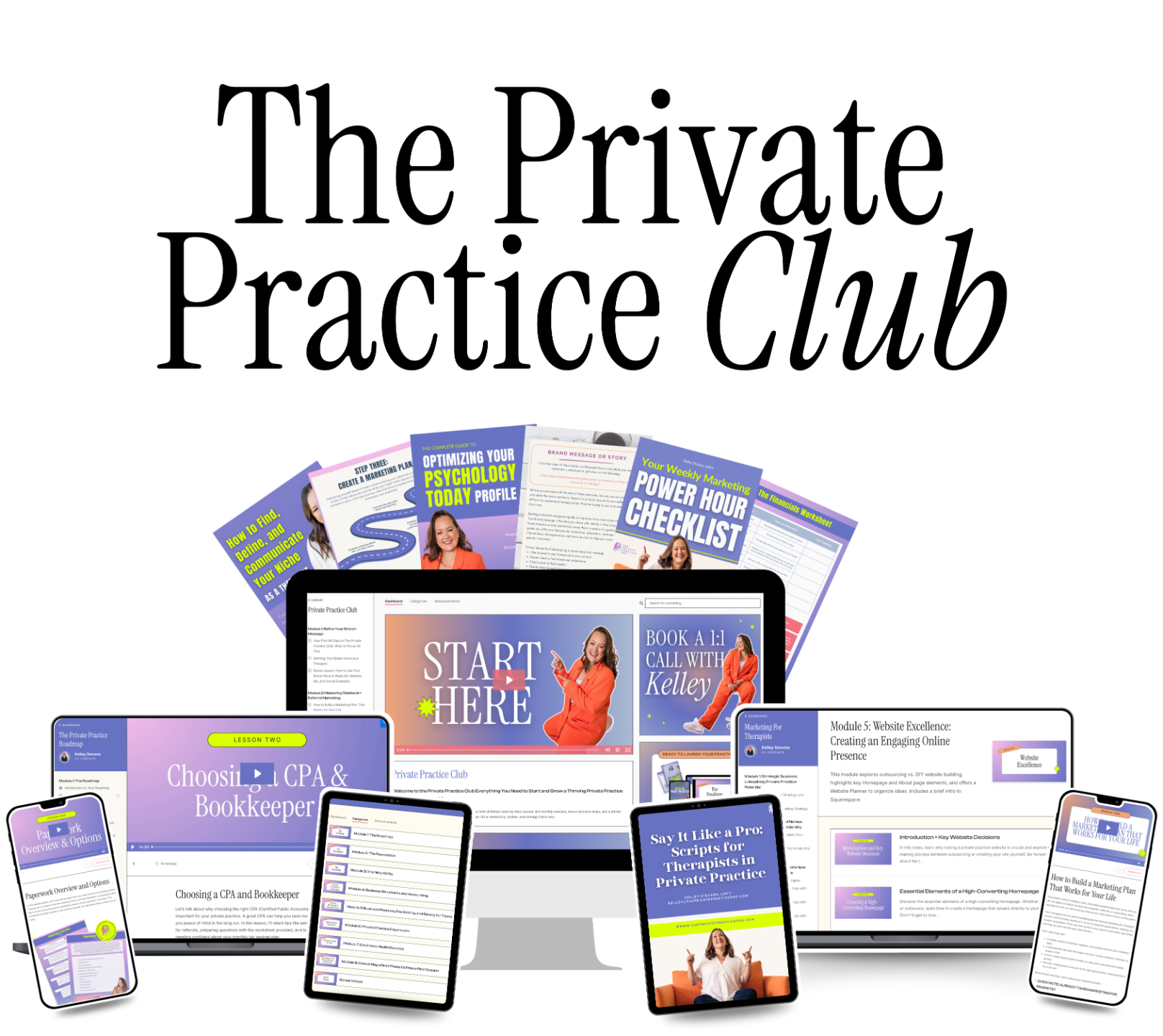 Think of this as your all-inclusive home base for private practice. You get every digital course I’ve ever created, group calls, templates, scripts, paperwork, and a community that actually shows up for you. It’s the place we meet every week so you never have to build your practice alone.