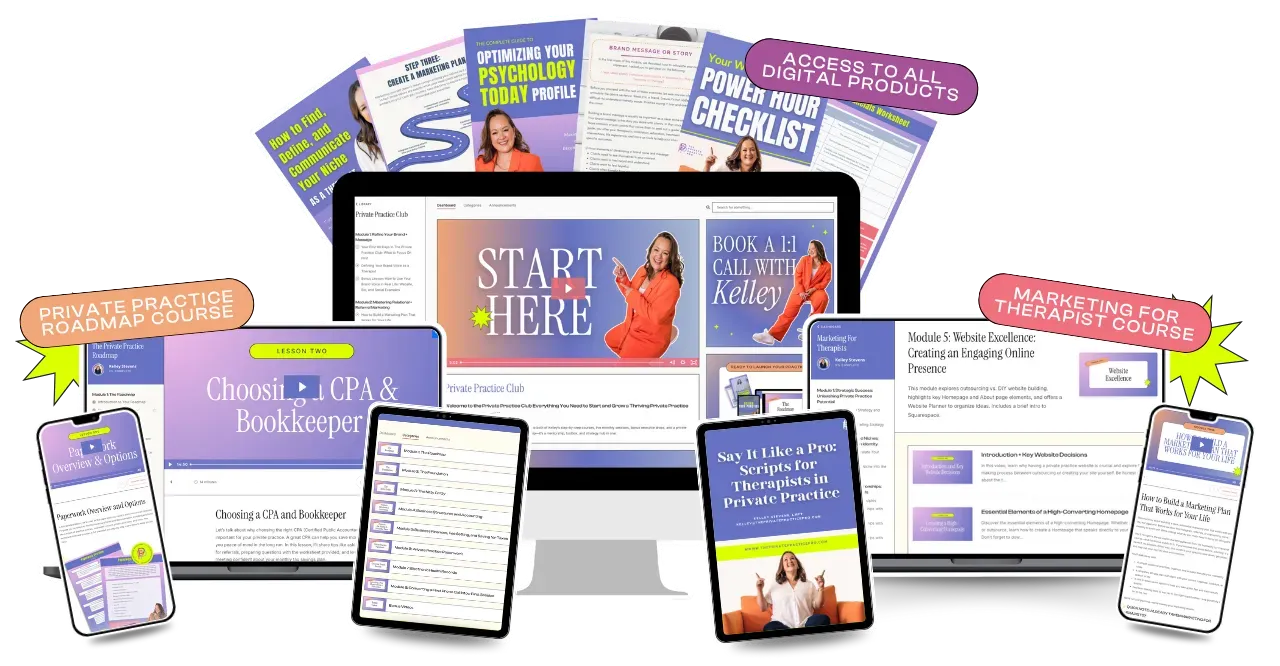 When you join early, you’ll unlock two full-length therapist courses (Marketing for Therapists and Private Practice Roadmap), over 40+ digital products, the Therapist Template Club, monthly live support, a private community, 50% off any future coaching sessions as a club member, and a 30-minute 1:1 coaching call with Kelley to help you start strong.